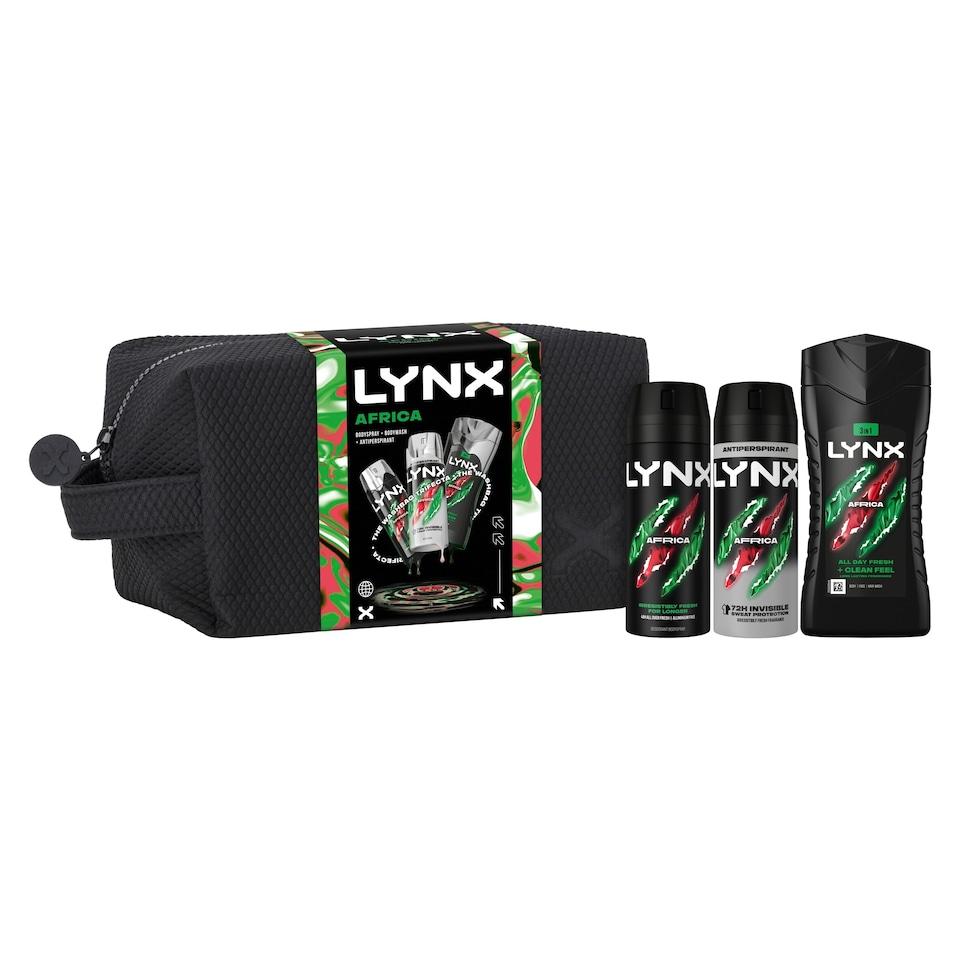 LYNX Africa Washbag Gift Set includes a full-size body wash, body spray and anti-perspirant deodorant, all tucked in a handy washbag.