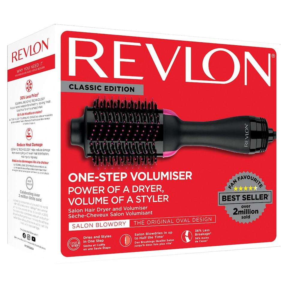 2-in-1 styling tool that drys & adds volume at the same timeBoosted Ionic Technology™ & ceramic coatingDetangling bristles and a professional swivel cordFor product information, visit us at www.revlonhairtools.shopOval Brush Design For smoothing the hair, create volume at roots and beautifully curled ends - No need to use another appliance to get waves Less Time, Less Damage Designed to distribute air quickly and evenly to the hair to dry and style faster for less heat damage IONIC TECHNOLOGY Negative ions saturate the airflow to reduce the size of water droplets for faster drying. This helps condition, smooth and makes hair shinier, while reducing frizz and static CERAMIC COATING For even heat distribution and less damage Mixed Bristles Nylon pin bristles with comfortable ball tips to softly detangle hair. Mixed nylon pin and boar bristles help grip hair on curved edge for improved volume and control for smooth, shiny results 3 Heat /2 Speed Settings Ergonomic Handle, Cool Tip and Lightweight Design Tangle-Free Swivel Cord 4 Year Limited Warranty.Box Contains1 X SALON ONE-STEP HAIR DRYER AND VOLUMIZER1) vs drying & styling separately.2) Based on third party testing