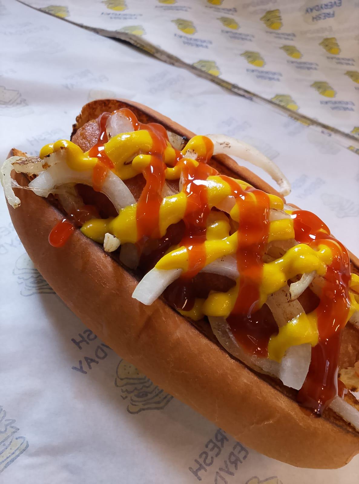 Award winning sausage covered in a delicious crispy batter on a hot dog bun, with onions, red sauce and mustard.